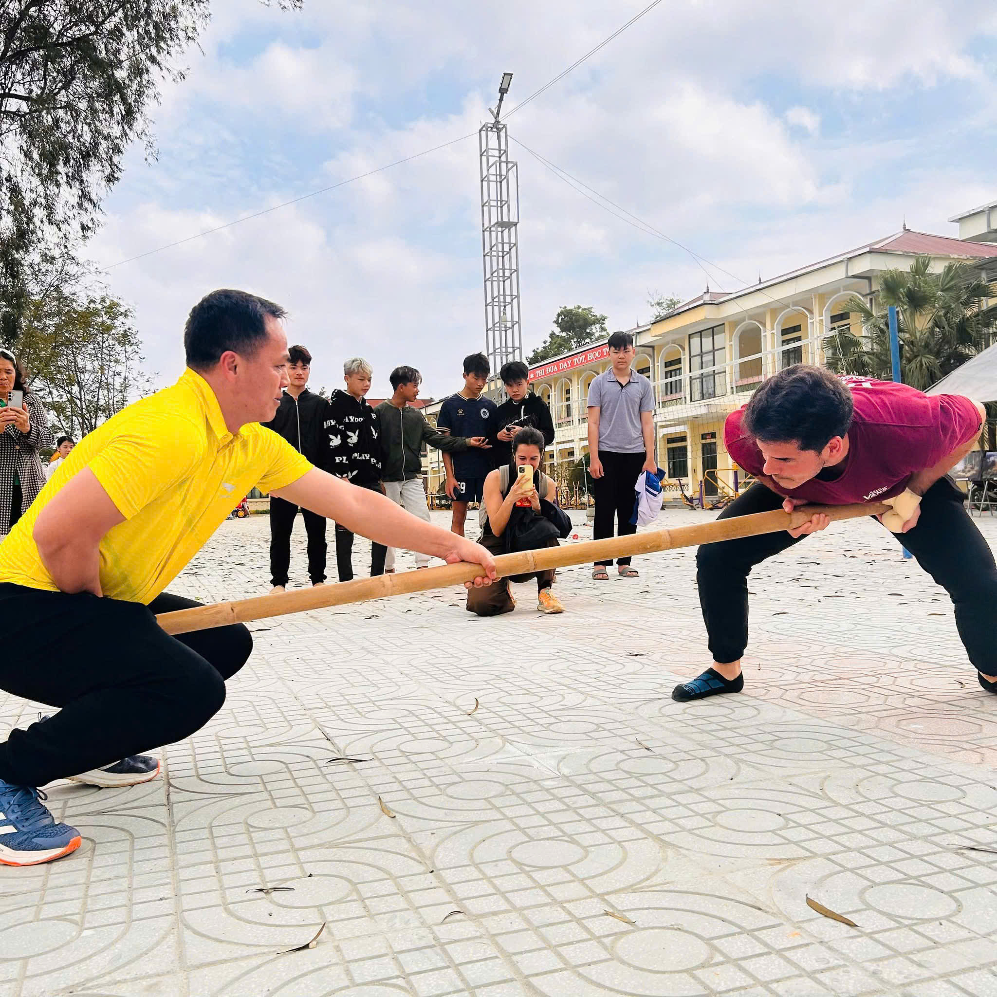 Du khách thử sức với trò chơi dân gian đẩy gậy tại Lễ hội