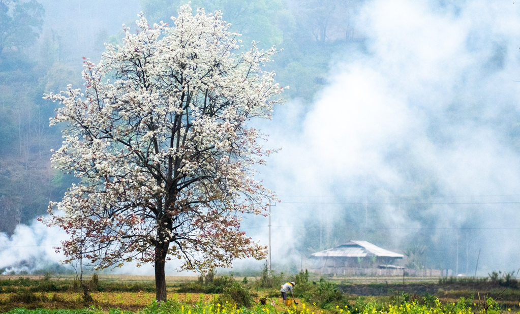 Không rực rỡ như hoa đào, không nồng nàn như hoa mận, hoa lê mang một vẻ đẹp thanh khiết và dịu dàng. Những cây lê hoa bung nở trắng xóa trên triền núi, xen giữa các nếp nhà sàn, ruộng nương và con đường nhỏ uốn lượn tạo nên khung cảnh nên thơ như một bức tranh thủy mặc.