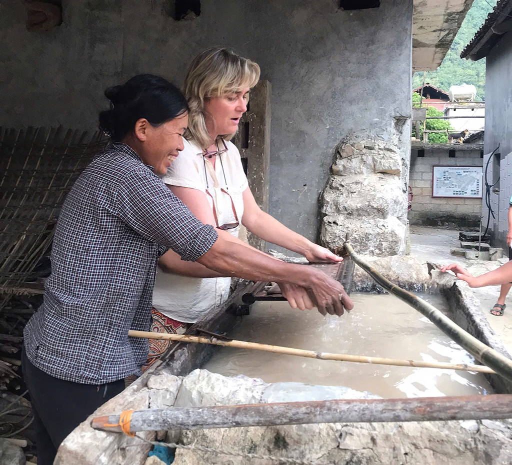 Du khách đến từ nước Đức trải nghiệm làm giấy bản tại xóm Dìa Trên, xã Phúc Sen, huyện Quảng Hòa.