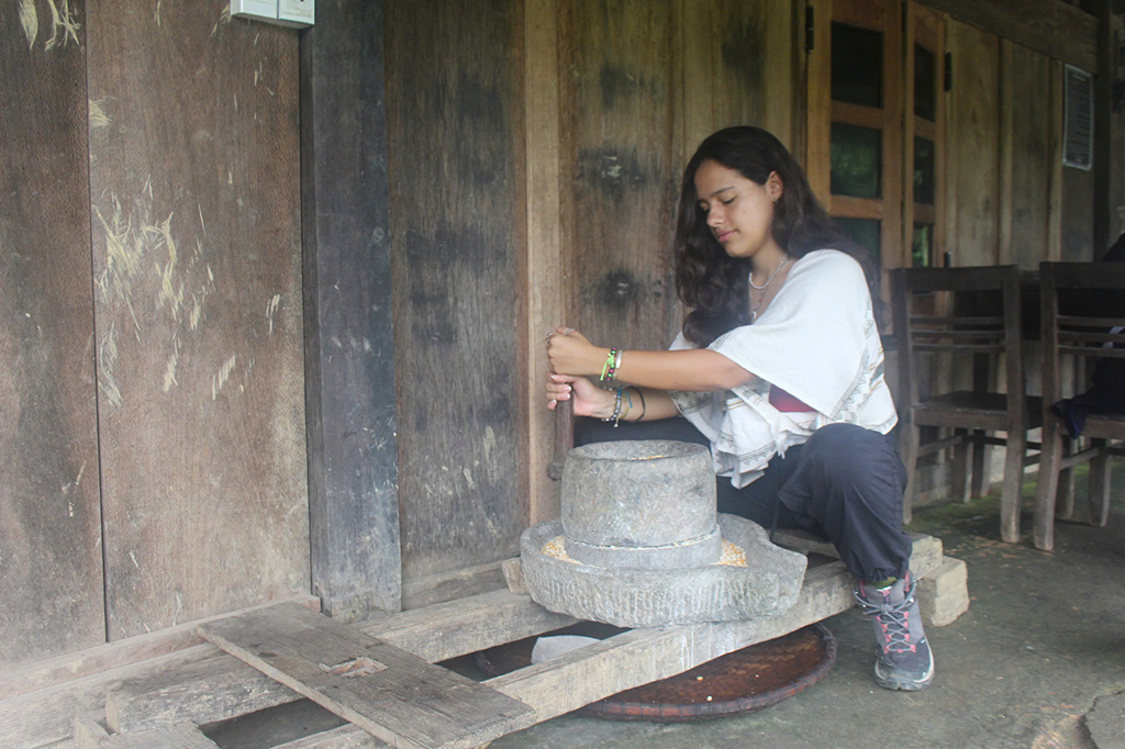 Bạn Maria (Mexico)trải nghiệm xay ngô tại Điểm du lịch cộng đồng Hoài Khao, xã Quang Thành, huyện Nguyên Bình.