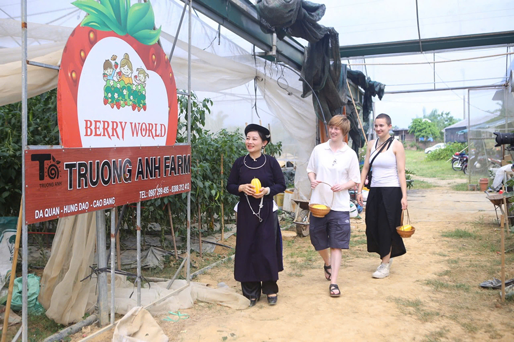 Hai bạn Clartje và Margot (Hà Lan) tham quan Hợp tác xã Nông nghiệp Trường Anh, xóm Đà Quận, xã Hưng Đạo, thành phố Cao Bằng.