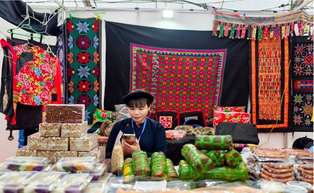 Các sản phẩm thổ cẩm, đặc sản của Cao Bằng được bày bán tại Hội chợ.