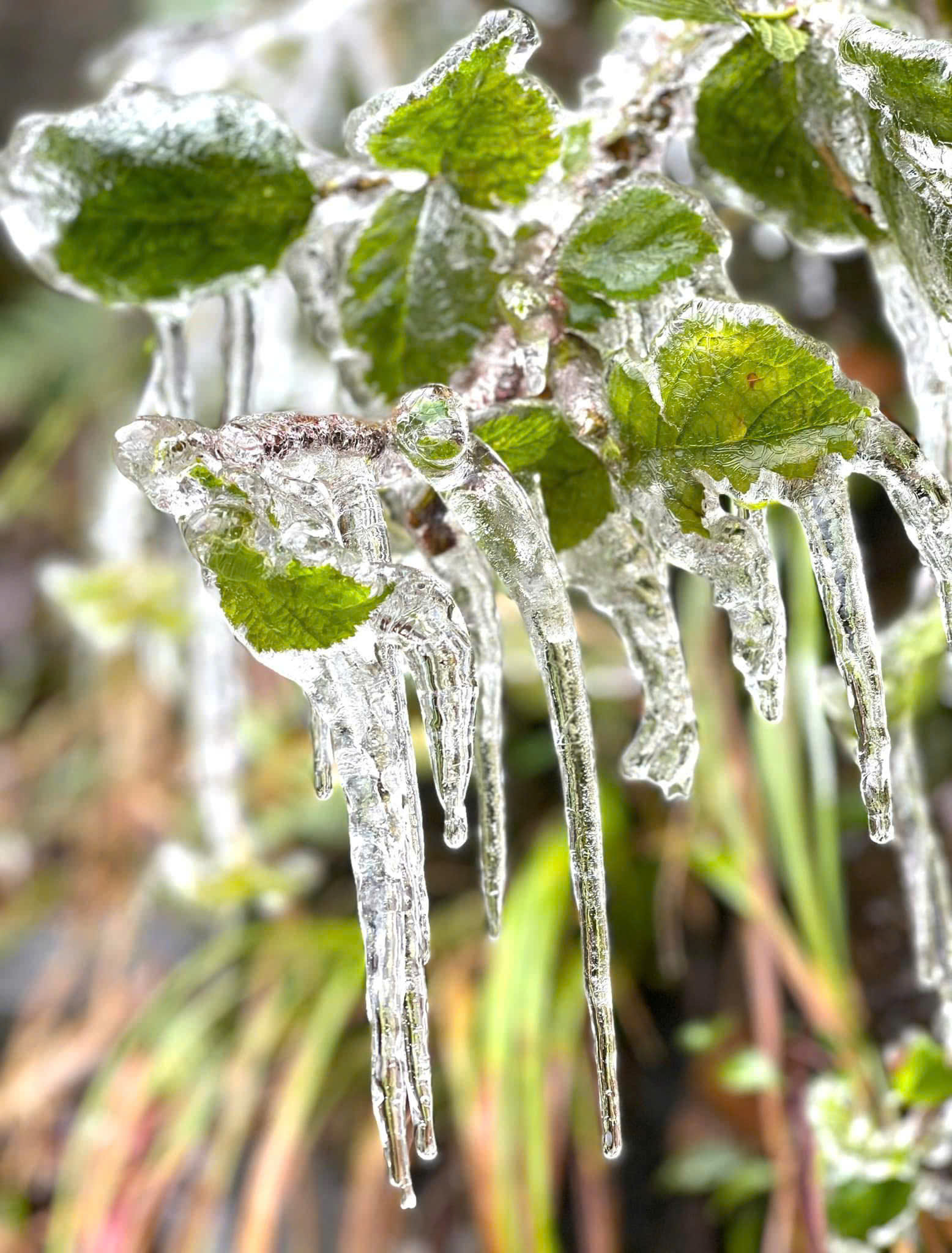 Những chiếc lá được phủ một lớp băng rủ xuống trông như ngọc.
