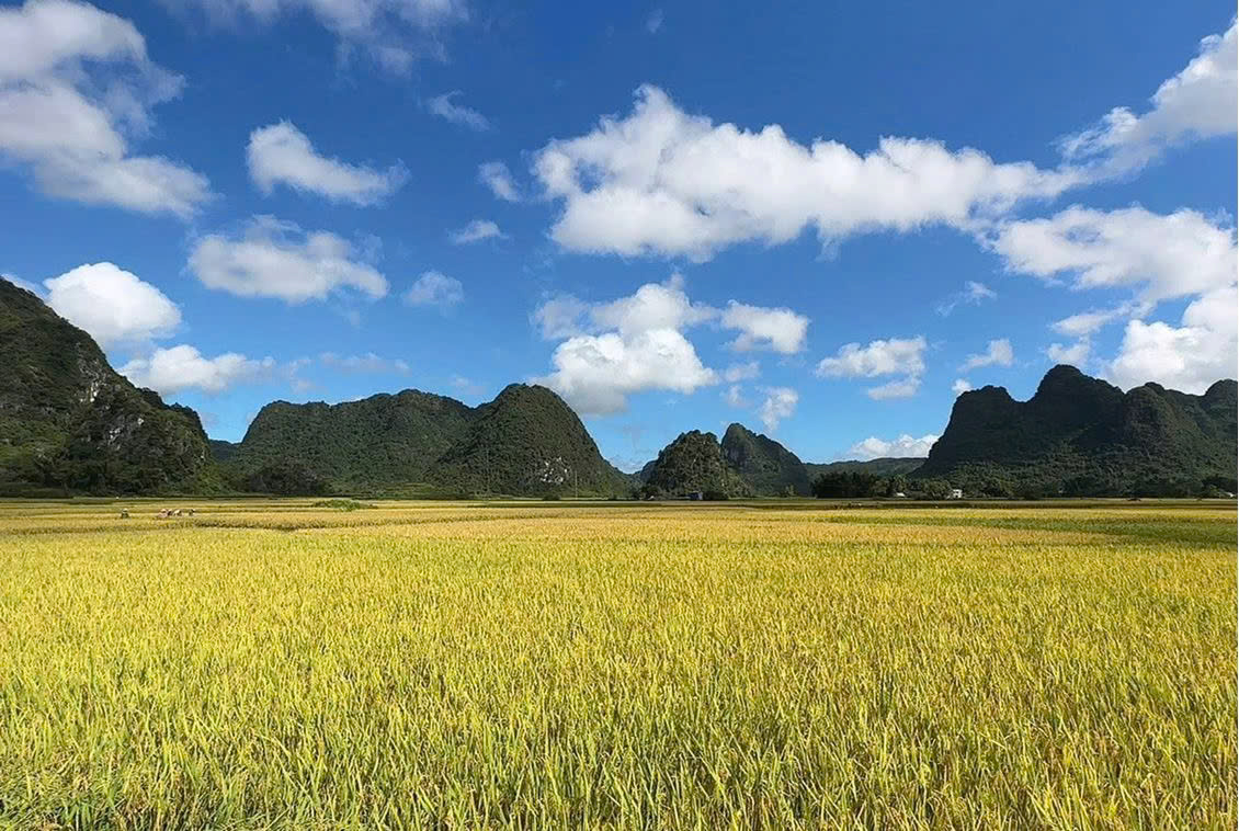 Khác với ruộng bậc thang dốc ngược của vùng Tây Bắc, những cánh đồng lúa ở Trùng Khánh (Cao Bằng) thường trải rộng trên những vùng tương đối bằng phẳng, được bao quanh bởi núi non trùng điệp và dòng sông Quây Sơn xanh ngắt. Khung cảnh ấy tạo nên một bức tranh thiên nhiên vừa hùng vĩ, vừa thơ mộng, đặc biệt quyến rũ vào khoảnh khắc bình minh và hoàng hôn khi ánh nắng dịu dàng, ấm áp nhuộm vàng cả không gian.