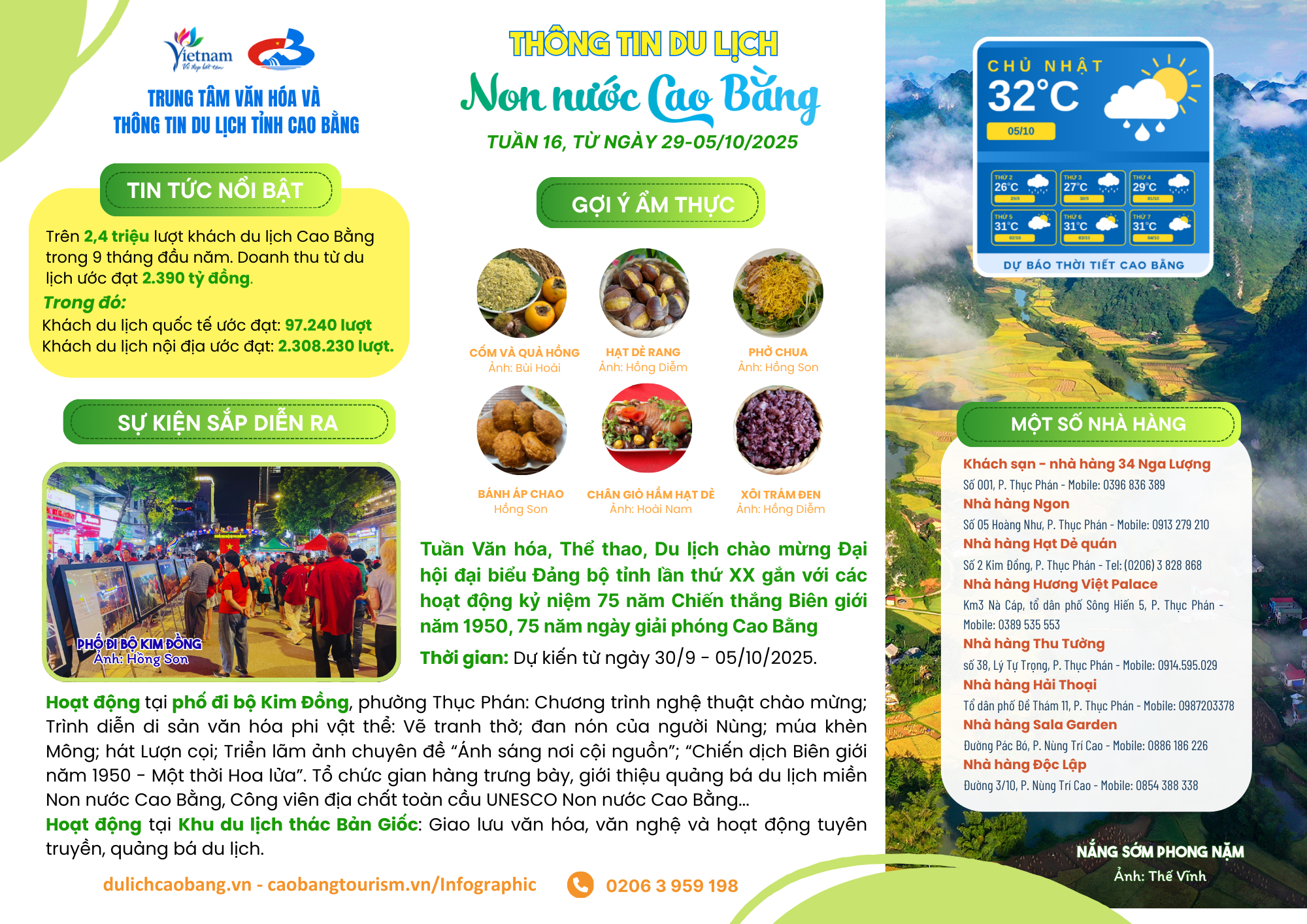 Ấn phẩm Thông tin Du lịch Non nước Cao Bằng – Tuần 16 (29/9 – 05/10/2025) cập nhật những con số ấn tượng về du lịch 9 tháng đầu năm, thông tin thời tiết, sự kiện văn hóa – thể thao – du lịch chào mừng Đại hội Đảng bộ tỉnh lần thứ XX và kỷ niệm 75 năm Chiến thắng Biên giới 1950. Bản tin cũng gửi đến du khách gợi ý ẩm thực đặc sản, danh sách một số nhà hàng uy tín cùng nhiều hoạt động trải nghiệm hấp dẫn tại Cao Bằng.
