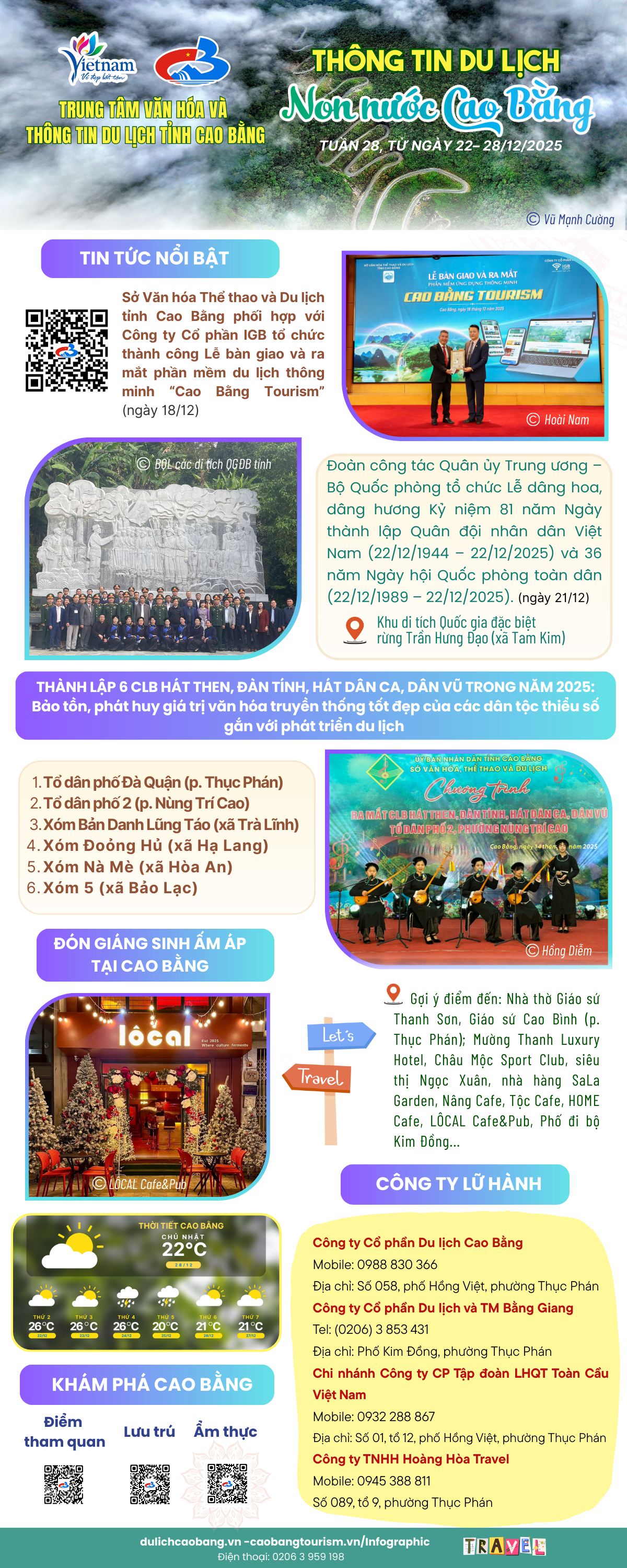 Ấn phẩm Thông tin du lịch Non nước Cao Bằng tuần 28 (22–28/12/2025) mang đến bức tranh sinh động về các sự kiện văn hóa – du lịch nổi bật, hoạt động kỷ niệm ý nghĩa cùng những điểm nhấn bảo tồn giá trị truyền thống. Đồng thời, ấn phẩm gợi ý không gian đón Giáng Sinh ấm áp và những trải nghiệm hấp dẫn để du khách khám phá Cao Bằng trong những ngày cuối năm.