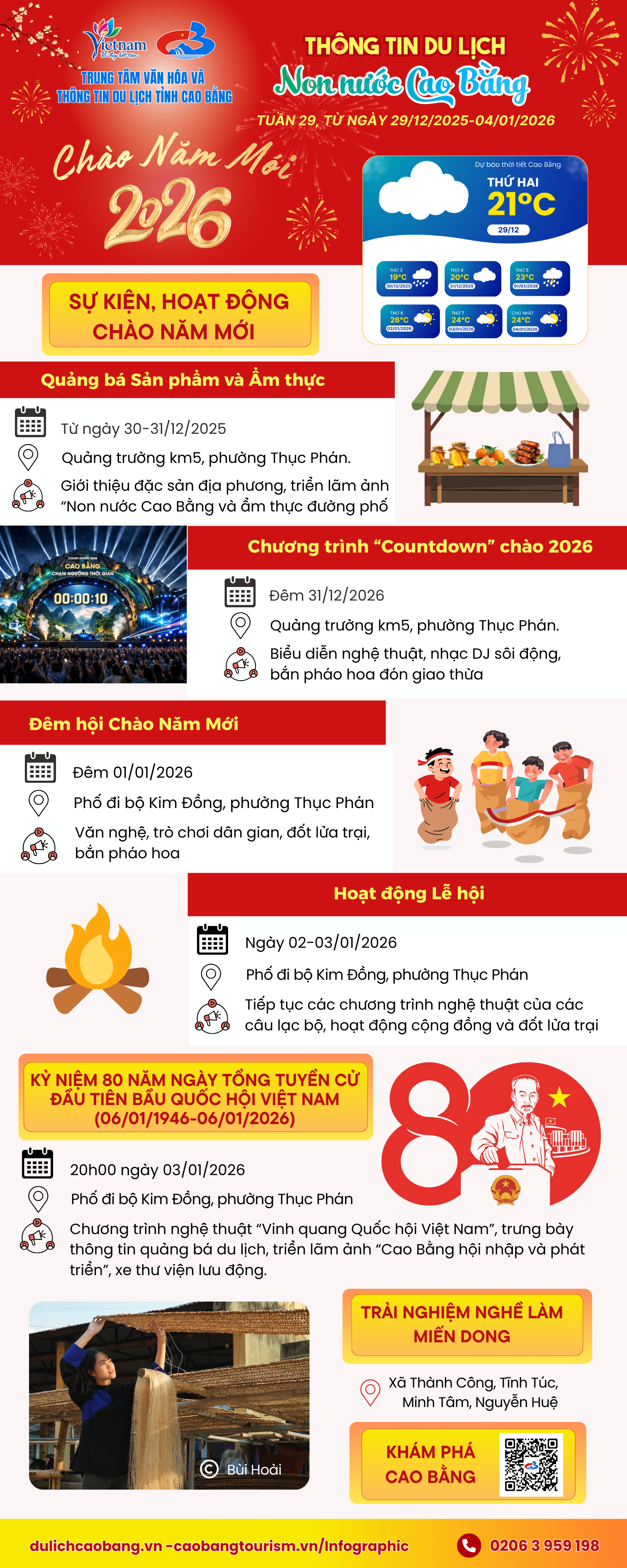 Trong không khí rộn ràng những ngày cuối năm 2025, ấn phẩm thông tin du lịch tuần này giới thiệu chuỗi hoạt động Chào năm mới 2026, kỷ niệm 80 năm ngày Tổng tuyển cử đầu tiên bầu Quốc hội Việt Nam (06/01/1946-06/01/2026), ấn phẩm gợi ý những điểm đến hấp dẫn dịp đầu năm để du khách trải nghiệm văn hóa bản địa trong tiết trời đẹp, khô ráo, nắng nhẹ của miền Non nước Cao Bằng.