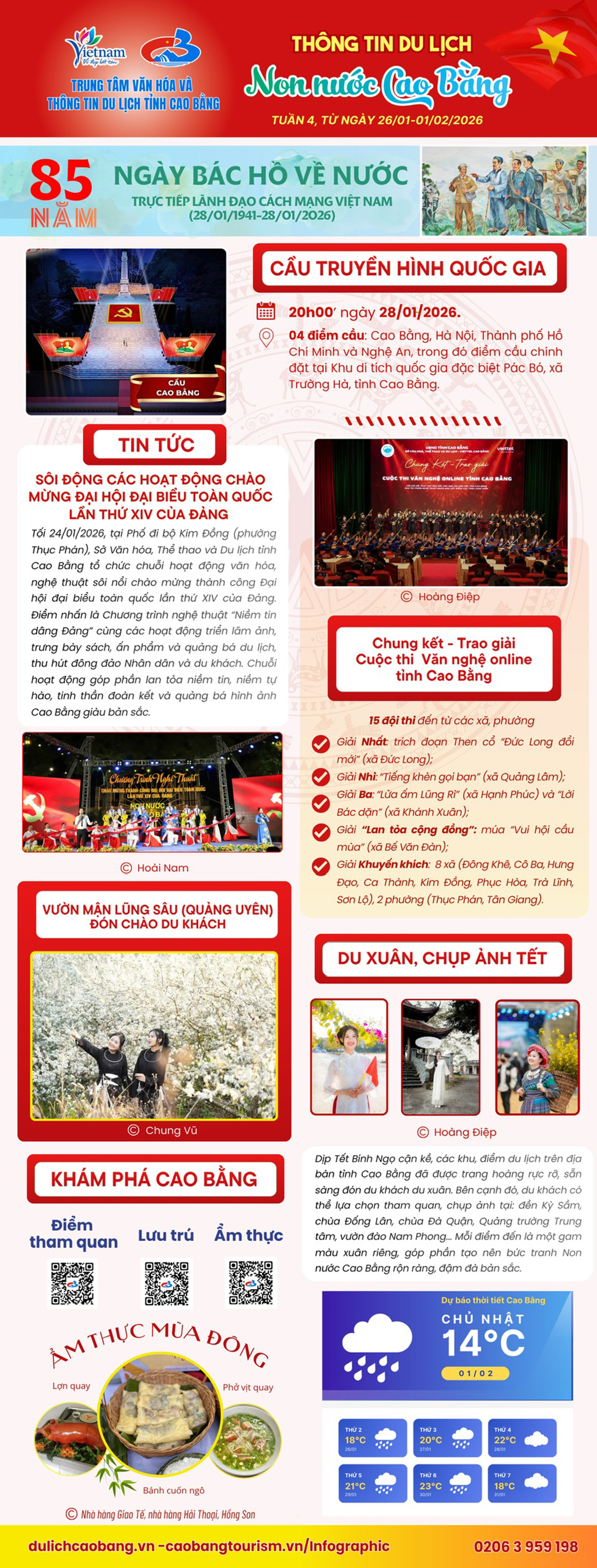 Tuần 4 (từ ngày 26/01 – 01/02/2026), hoạt động du lịch Cao Bằng diễn ra sôi nổi, gắn với chuỗi sự kiện kỷ niệm 85 năm Ngày Bác Hồ về nước (28/01/1941 – 28/01/2026). Điểm nhấn của tuần là Cầu truyền hình quốc gia tổ chức tại Khu di tích quốc gia đặc biệt Pác Bó, cùng nhiều chương trình văn hóa, nghệ thuật, du xuân – chụp ảnh Tết và trải nghiệm ẩm thực mùa đông, góp phần quảng bá hình ảnh Non nước Cao Bằng giàu bản sắc, thân thiện và hấp dẫn du khách.