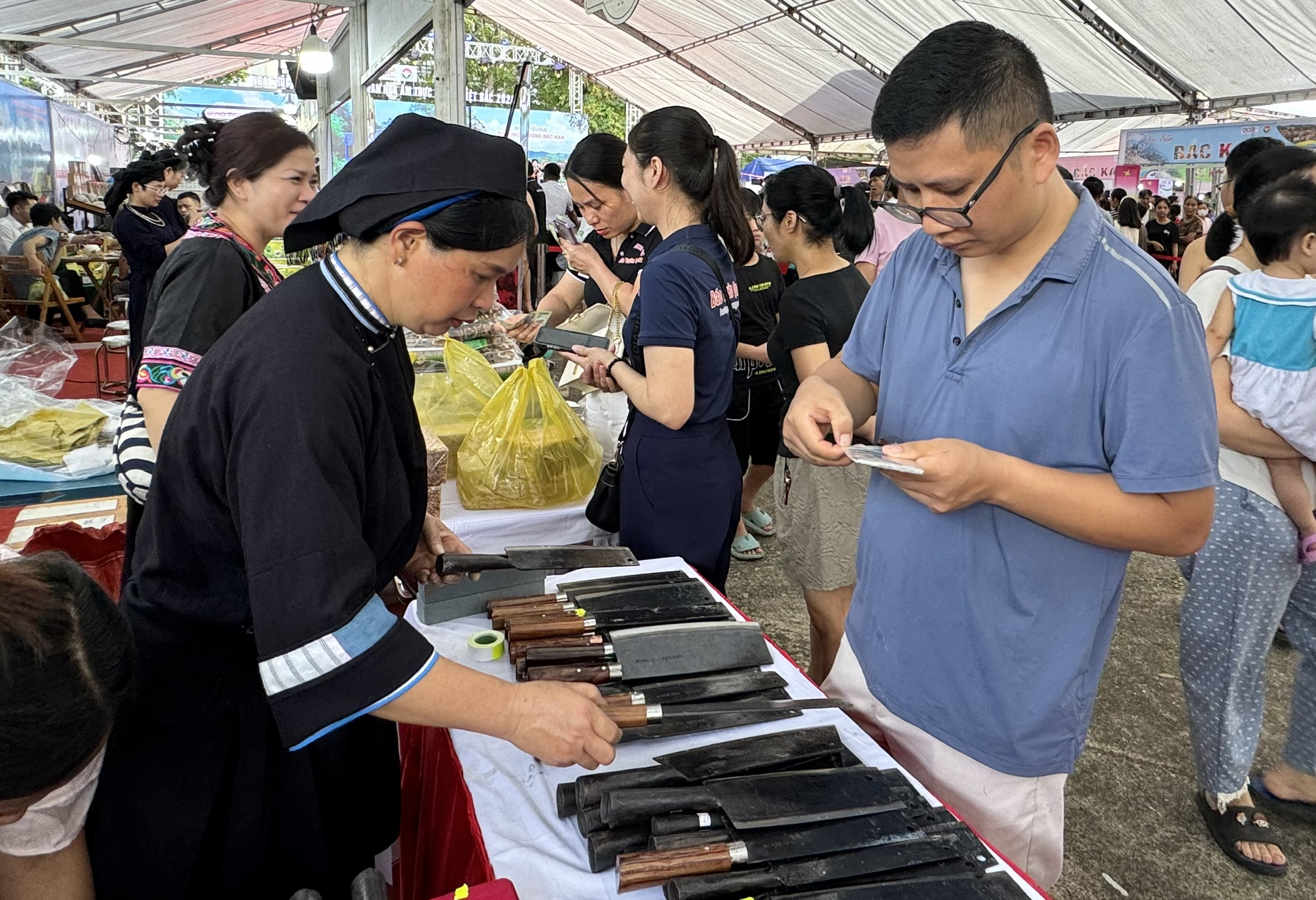 Khách du lịch tìm hiểu về các sản phẩm dao của làng rèn Pác Rằng