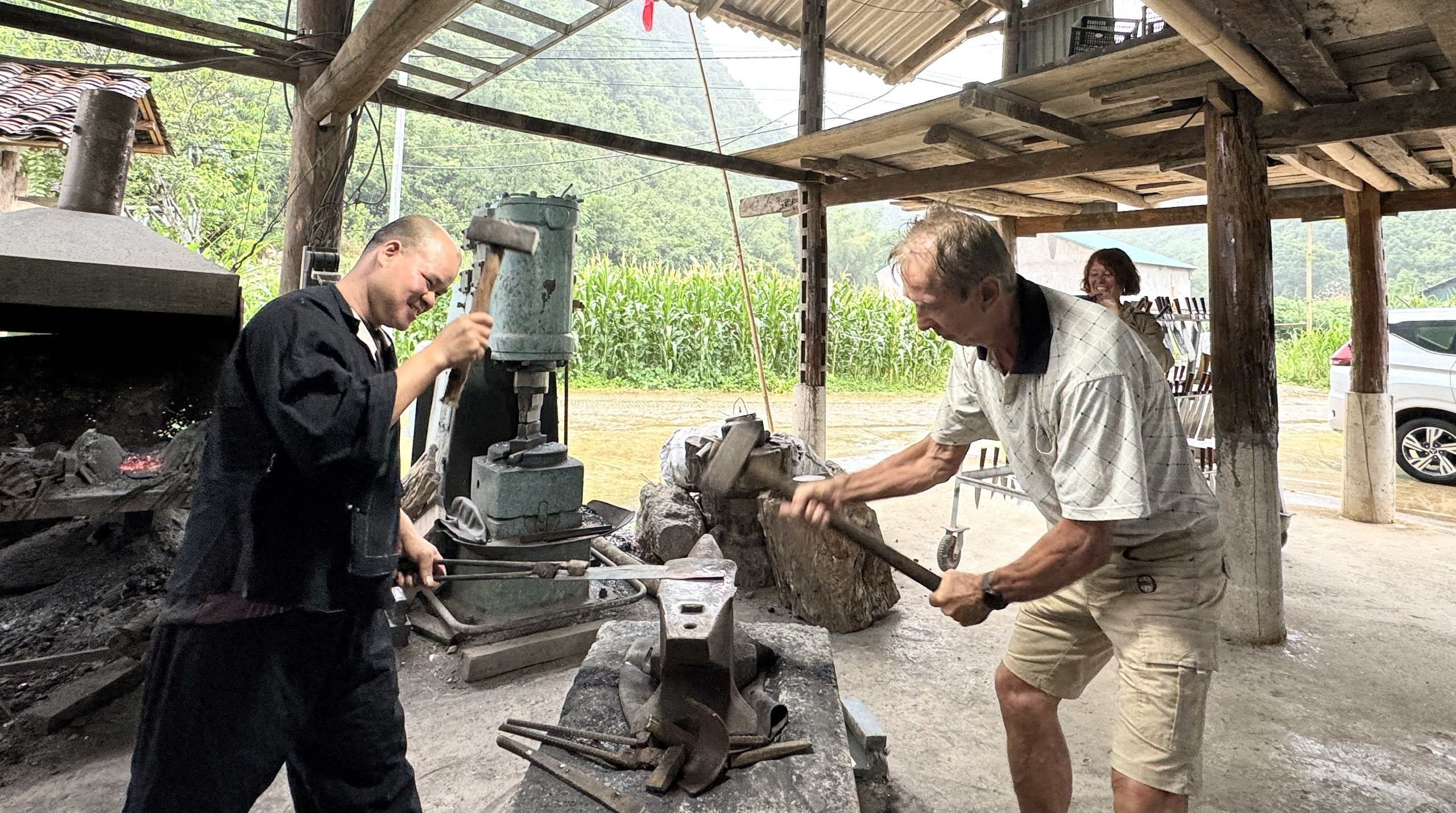 Khách du lịch nước ngoài trải nghiệm làm dạo tại làng rèn Pác Rằng