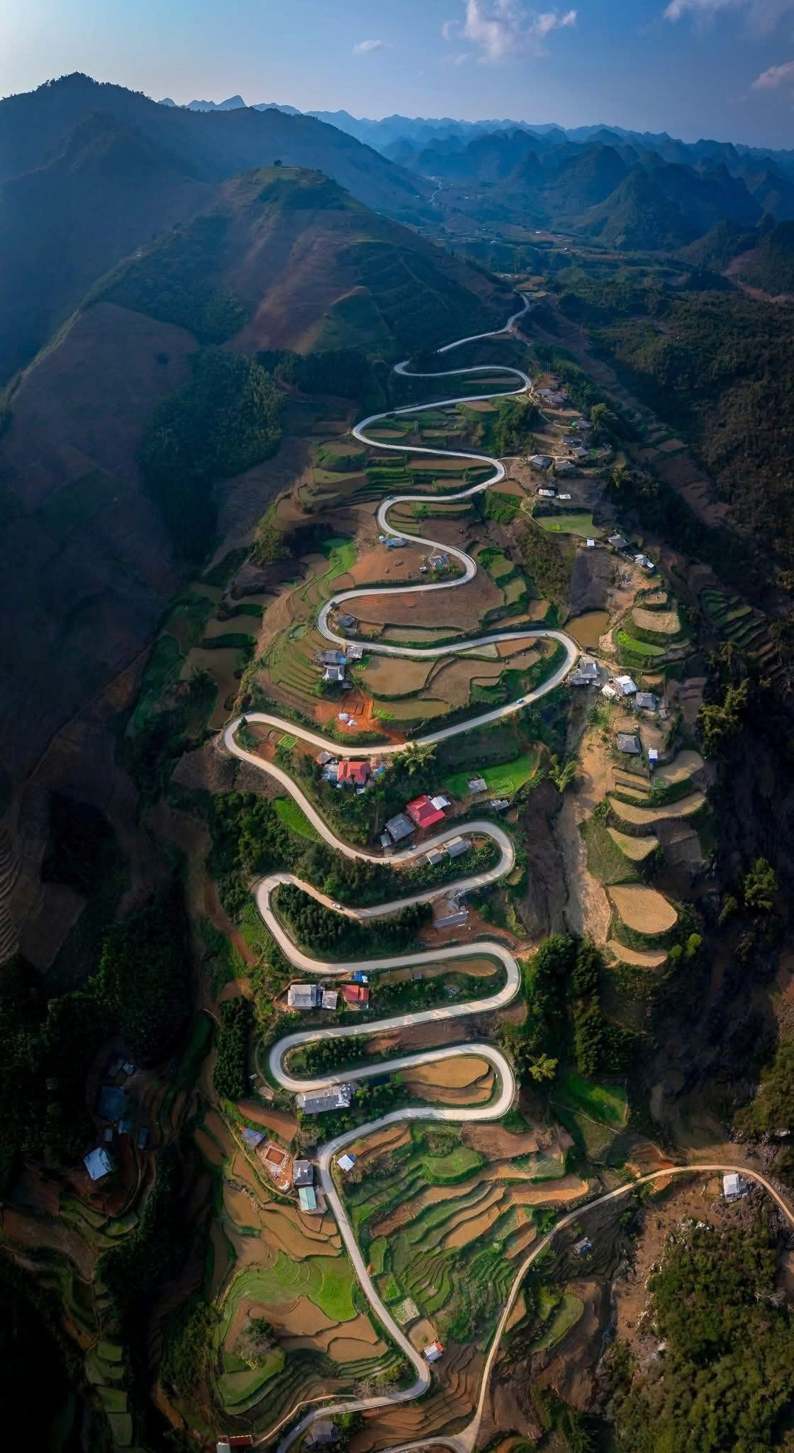 Đèo Nà Tềnh với những khúc cua men theo sườn núi, ôm trọn những thửa ruộng bậc thang và bản làng yên ả